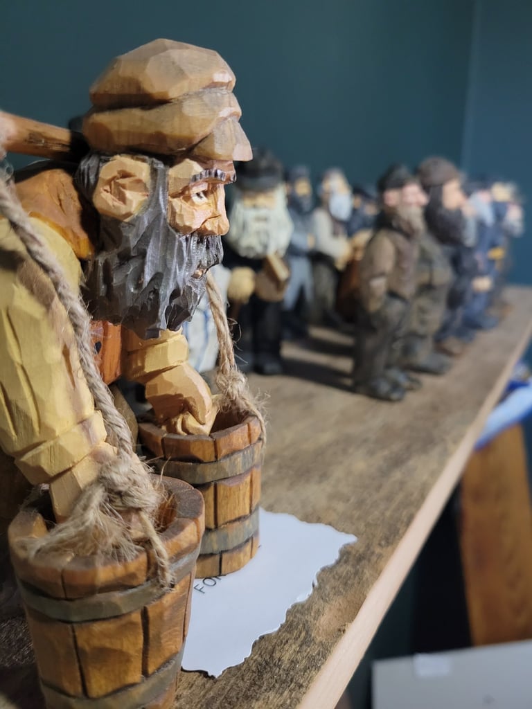 Group carvings that bring historical and cultural figures to life, telling stories through wood.