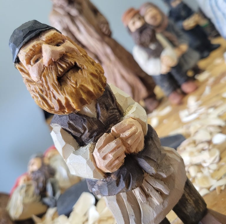 Group carvings that bring historical and cultural figures to life, telling stories through wood.